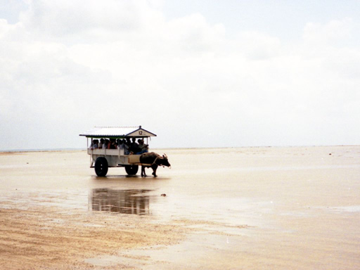 西表島からすぐ隣の由布島までは浅瀬が続いています。ここでは人を運ぶために牛車が使われています。 この写真を今年の年賀状に使いました。だーっと広がる浅瀬の海と空、そこにのんびりと移動する牛車がぽつんとひとつ。沖縄民謡の三線の音が聞こえてきそうです。