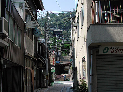 アーケードのある商店街と交差する細い路地から、階段とその上のお寺が見えます。 ここからそのまま180°振り返ると、このお寺と同じぐらい先はもう海です。