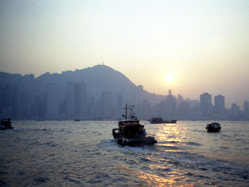 九龍半島スターフェリー乗り場近くの公園から香港島を臨む夕暮れ。