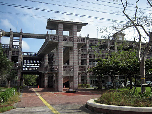今回の旅行の目的の一つは、この名護市役所の建物を見に行くことでした。 沖縄の伝統的建築のテイストも入っているとは思いますが、完全に昇華されて何ものにも似ていないオリジナリティとなっています。 構造は複雑ですが、近くで見るとごく普通のブロック塀みたいな素材でした。材料費は意外と安いのかも。 それにしても、このデザインを承認した名護市はあっぱれとしか言いようがありません。