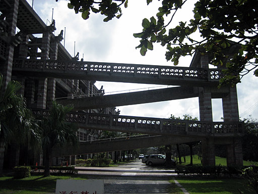 今回の旅行の目的の一つは、この名護市役所の建物を見に行くことでした。 沖縄の伝統的建築のテイストも入っているとは思いますが、完全に昇華されて何ものにも似ていないオリジナリティとなっています。 これは、メインの建物から大胆に飛び出したスロープ。