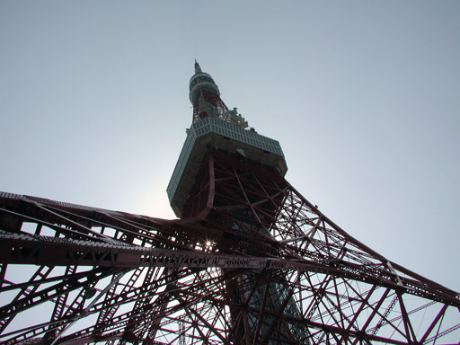 ふもとから見上げた東京タワーの頂き。