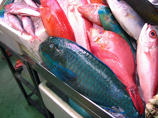 那覇の国際通り近くに、公設市場というところがあり、肉、魚、野菜、その他さまざまな食材が売られています。