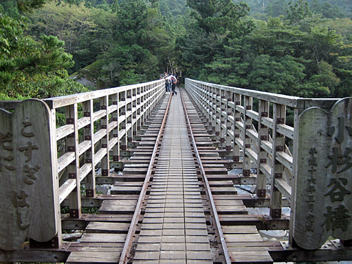 実はこのトロッコ列車は今も運転されています。運転本数は極めて少なく、定期運行しているわけではなさそうでしたが、登山者が列車と出くわした場合に備えて、線路脇に待避所がいくつも設けてありました。 この橋の上で列車に出会うと逃げ場がないので、橋のたもとに信号機が設置してあり、列車が近づいているときには登山者が橋に進入しないよう、注意書きがありました。