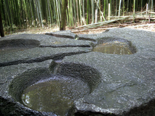 「酒船石」と呼ばれている石です。お酒を造るのに使われたとか、色々な説があるそうです。確かに、液体を流すようなくぼみがついています。